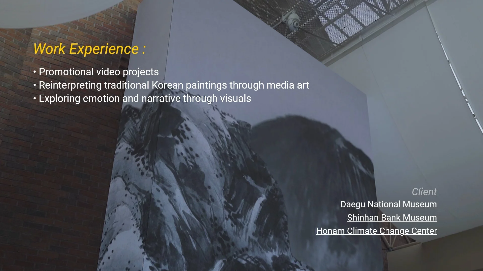 Chiara's arrival was an unexpected and welcome jolt, inspiring me out of my creative rut. Collaborating with someone from a different background was an enjoyable challenge. Despite initial difficulties with the unfamiliar environment and language, Chiara quickly adapted and grew, participating in various client projects, including promotional videos for the Shinhan Museum and animation work for traditional Korean paintings at the Daegu Museum.